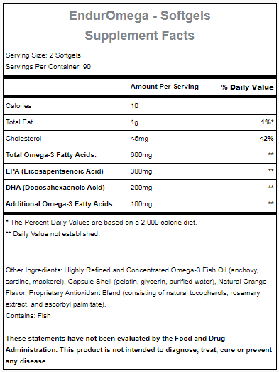 Chứa các axit béo thiết yếu bạn cần ở dạng an toàn và tiện lợi, Enduromega có dầu cá được chưng cất và khử mùi phân tử, không có mùi và vị tanh, và được kiểm tra thông qua các phòng thí nghiệm độc lập của bên thứ ba để đảm bảo hiệu quả và độ tinh khiết. Phân tích thành phần: